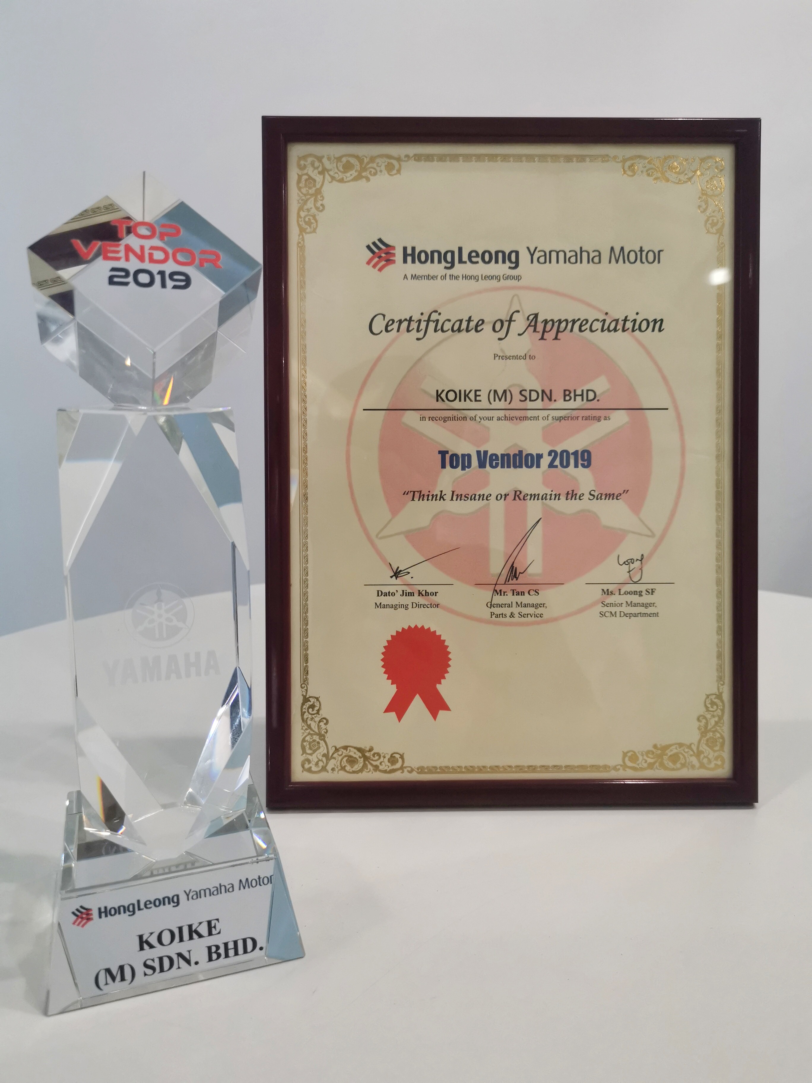 2019/11/01 お知らせ 【11年連続】KOIKE(M)が、2019年HongLeong Yamahaトップベンダー賞を受賞しました。 弊社現地法人 KOIKE(M)は、現地で自動車二輪パーツの組み立て事業を行っており、 今年もHongLeong Yamahaのトップベンダー賞を受賞する事が出来ました。今期で通算11年連続の受賞となります。今後とも、変わらぬご支援ご協力の程宜しくお願い致します。